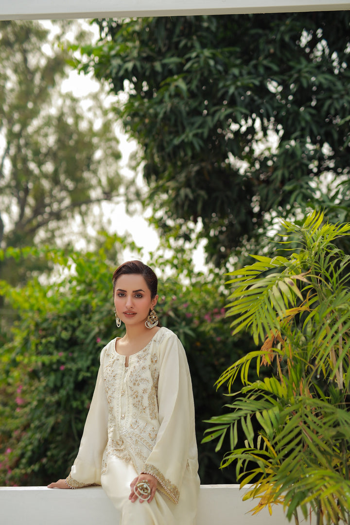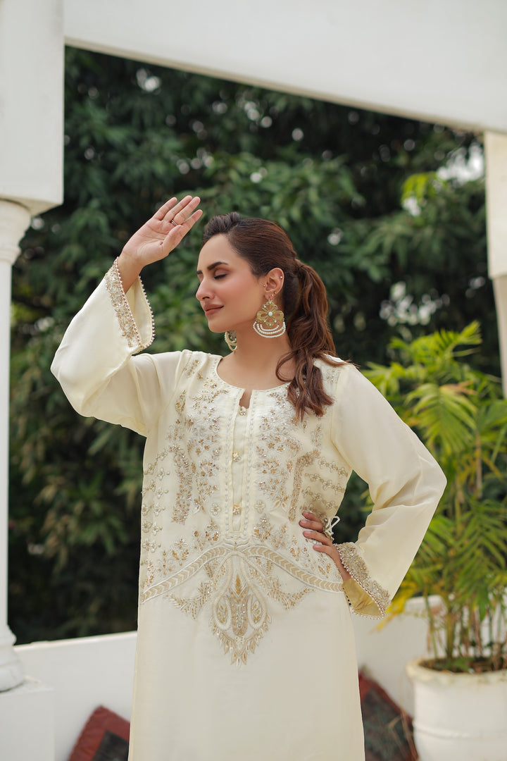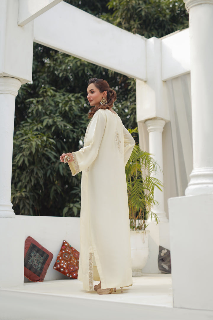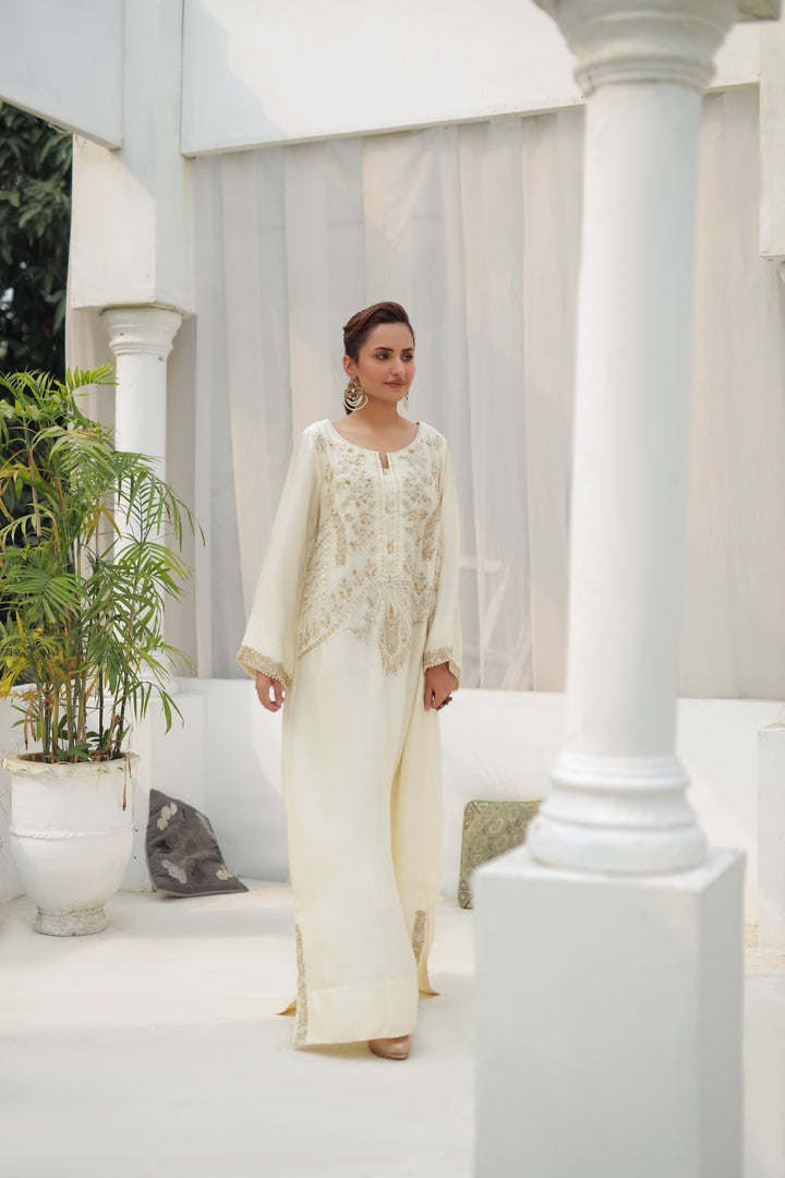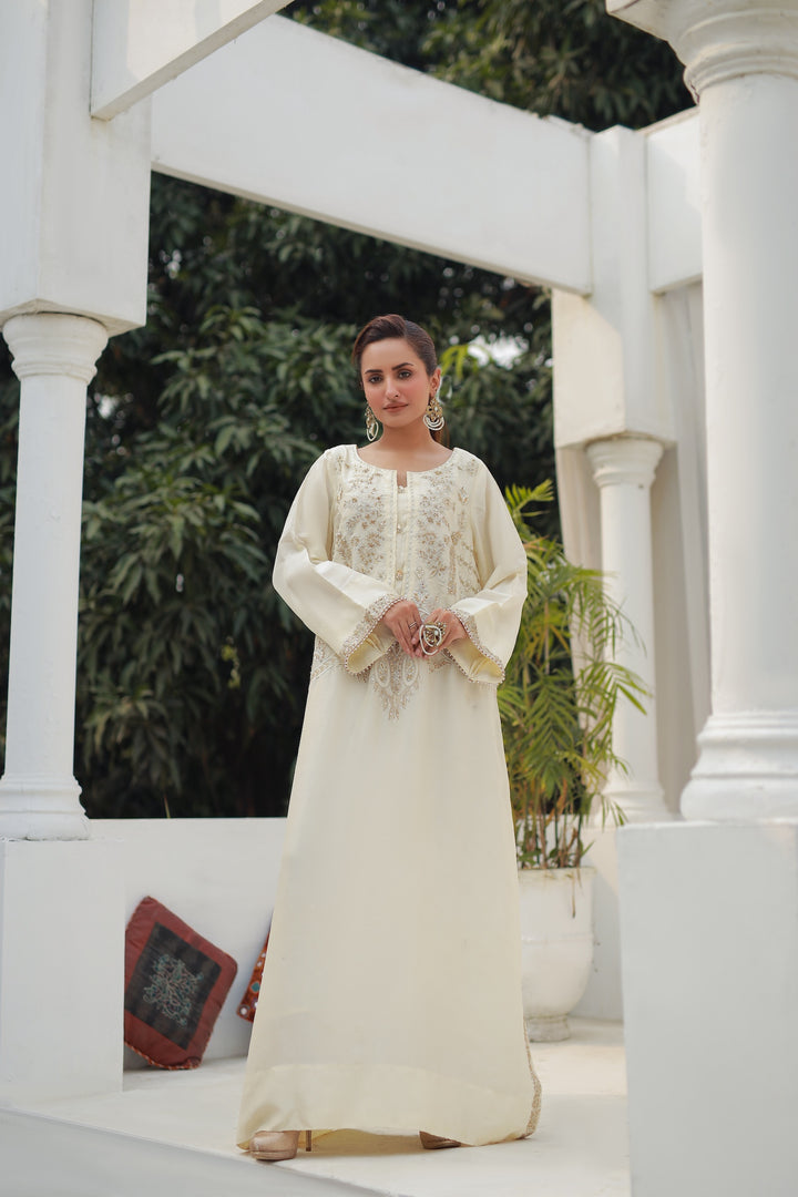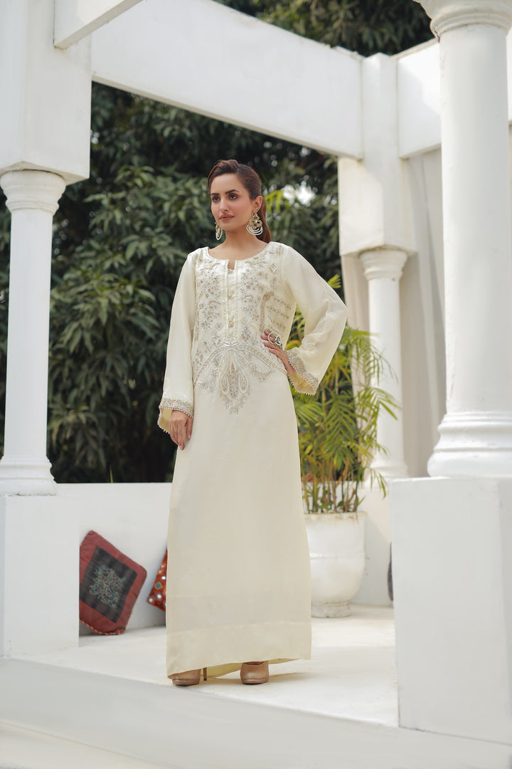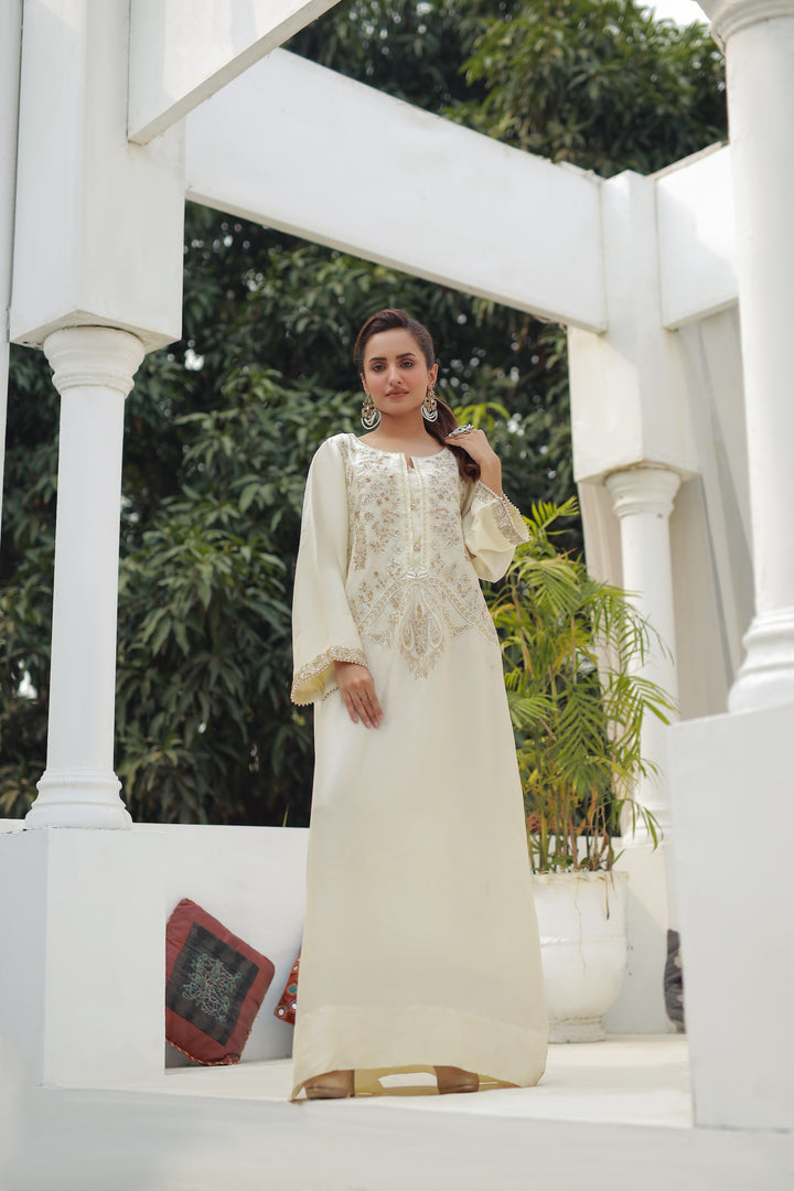 Flowing blush soft white kaftan crafted from soft silk blend, adorned with intricate front embroidery in silver and rose tones. Effortless and graceful, this one-piece ensemble is perfect for chic garden gatherings or evening soirées.