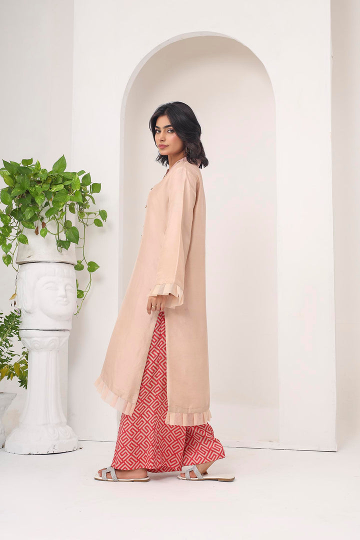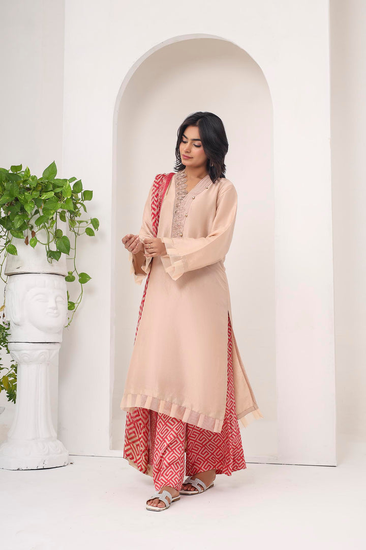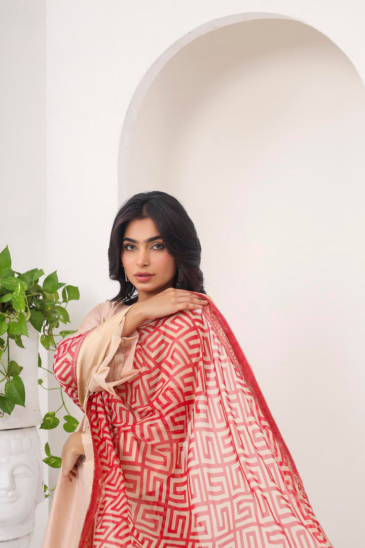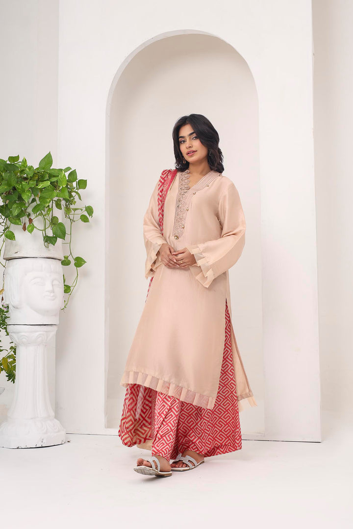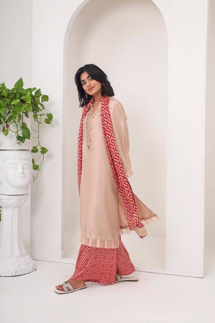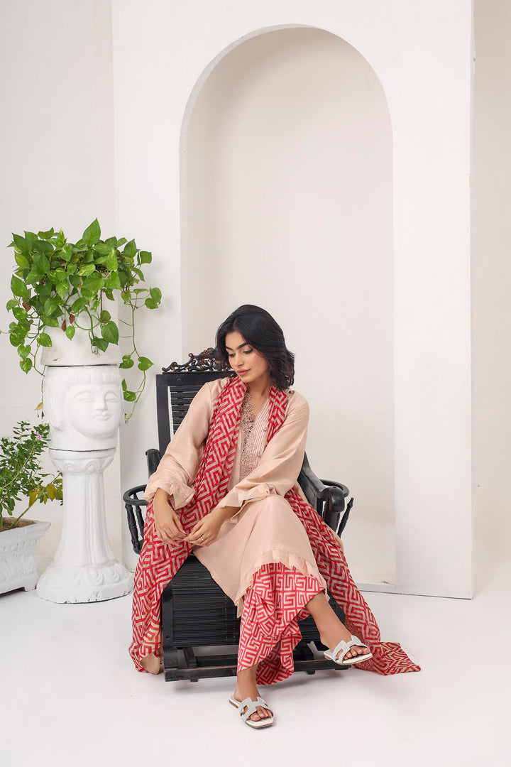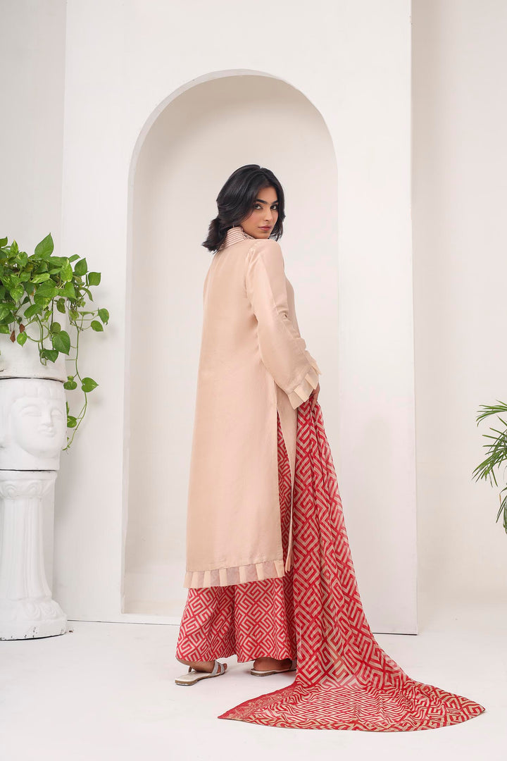 Pearl Geometry Fabric: 80g Pure Raw Silk (Shirt), Chiffon (Dupatta), Chamois Silk (Trouser)Work: Delicate Embellishment, Printed Dupatta & Trouser